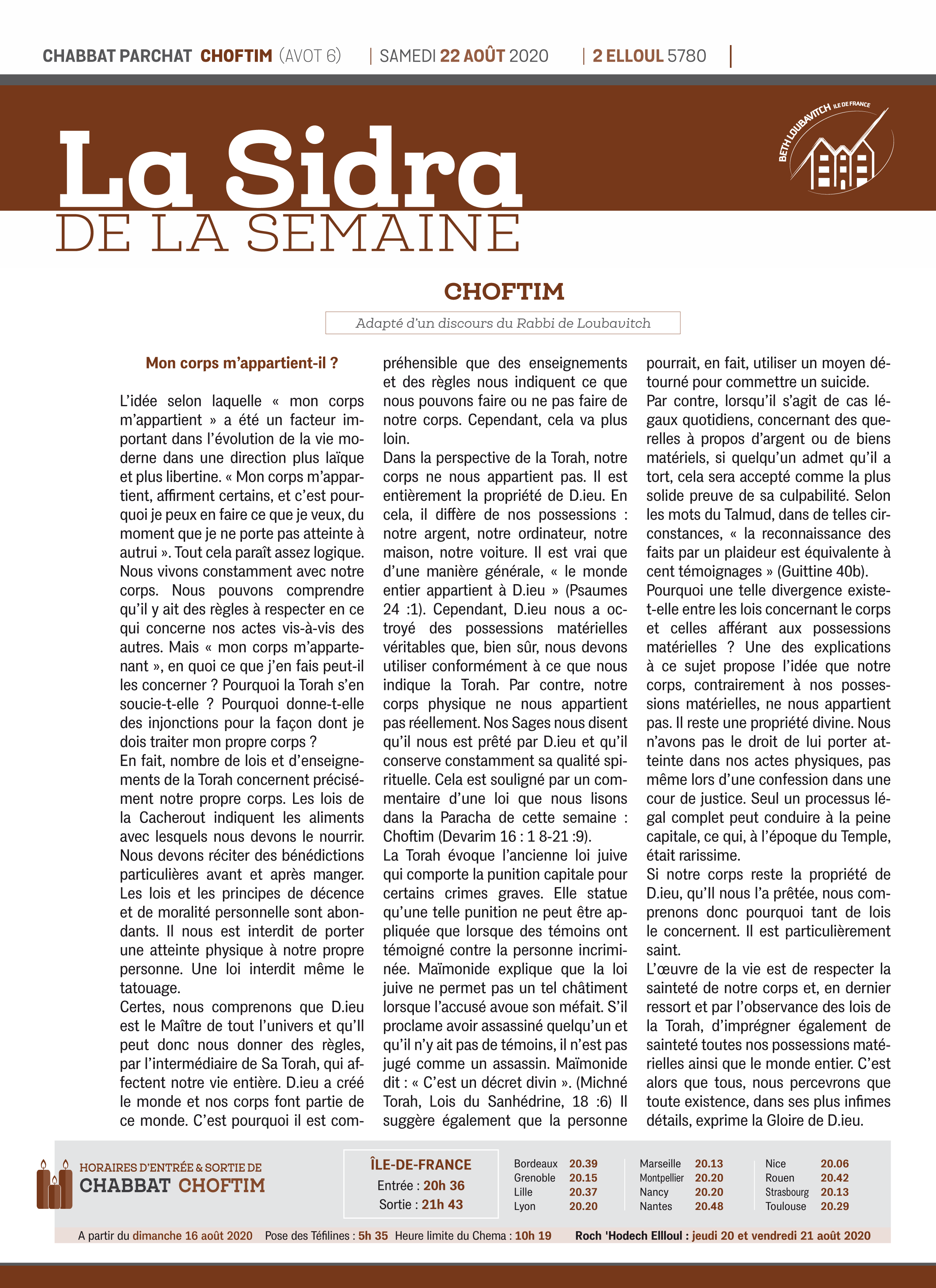 Dans la perspective de la Torah, notre corps ne nous appartient pas. Il est entièrement la propriété de D.ieu. En cela, il diffère de nos possessions : notre argent, notre ordinateur, notre maison, notre voiture. Il est vrai que d’une manière générale, « le monde entier appartient à D.ieu » (Psaumes 24 :1). Cependant, D.ieu nous a octroyé des possessions matérielles véritables que, bien sûr, nous devons utiliser conformément à ce que nous indique la Torah. Par contre, notre corps physique ne nous appartient pas réellement. Nos Sages nous disent qu’il nous est prêté par D.ieu et qu’il conserve constamment sa qualité spirituelle. Cela est souligné par un commentaire d’une loi que nous lisons dans la Paracha de cette semaine : Choftim (Devarim 16 : 1 8-21 :9).